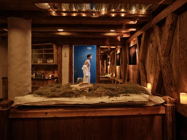 Une vraie spécialité parmi nos enveloppements! Allongé-e sur du foin alpin, vous êtes enveloppé-e dans une crème de soin à l'huile d'onagre, dont les propriétés relipidantes et hydratantes régénèren votre peau tour en l'aidant à lutter contre le vieillissement. L'odeur agréable du foin invite à la détente. Fermez les yeux.. Vous voici dans une prairie en fleurs entourée de montagnes.